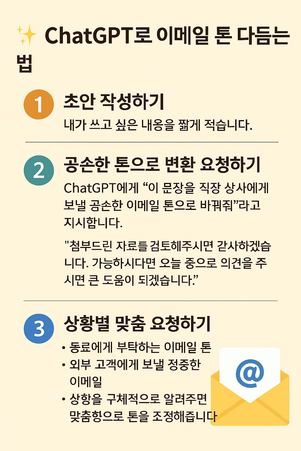 - ChatGPT에게 *“이 문장을 직장 상사에게 보낼 공손한 이메일 톤으로 바꿔줘”*라고 지시합니다.